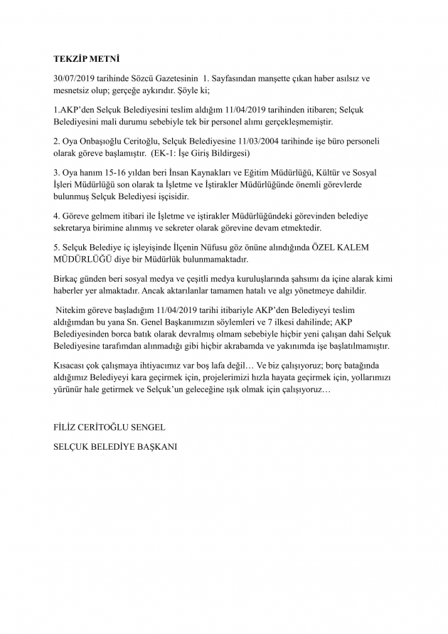 “Bu noktada sosyal medyada ve çeşitli gazetelerde yer alan gazetelerin asılsız, mesnetsiz ve sadece yıpratmaya yönelik olduğunu da belirtmek istiyorum. Selçuk halkının sadece tüm gerçeği bilmesine karşılık bilip de bilmezliğe gelenleri ayrı yere koyarak ulusal medya ve aynı zamanda tüm Türkiye gerçekleri bilsinler istiyorum. Adı geçen Oya Onbaşıoğlu Ceritoğlu, benim sekreterimdir. Ancak kendisi işe yeni alınan bir personel değildir. 16 yıldır Selçuk Belediyesi’nin önemli birimlerinde önemli görevlerinde yer almış bir çalışandır.